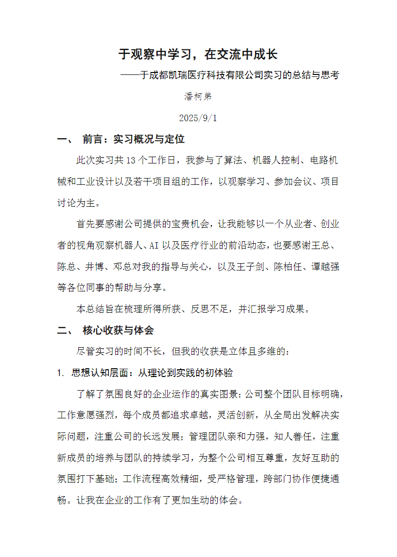 这个秋天,一封特别的心得体会悄然抵达我们的邮箱。它来自同济大学一位年轻的学子,字里行间记录的不是旅途的风景,而是在凯瑞医疗这段实习时光里,关于成长、挑战与温暖的点点滴滴。
